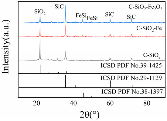 The experimental results confirm that the addition of Fe and Fe2O3 significantly promoted the progress of the carbon thermal reduction reaction. The mass loss analysis data showed that the experimental group with added Fe and Fe2O3 had significantly increased mass loss, and the amount of generated gas-phase products also increased. The XRD pattern analysis confirmed this conclusion. These data indicate that the introduction of Fe and Fe2O3 significantly improves the conversion rate of SiO2 and generation of SiC. Comparing the effects of the two catalysts, Fe2O3 exhibited superior catalytic performance.