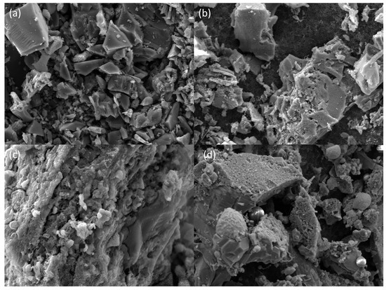 Electron microscopy image of the reaction product between char and silicon: (a) C, (b) C-SiO2, (c) C-SiO2-Fe, and (d) C-SiO2-Fe2O3.