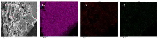 SEM elemental mapping of carbon–silicon dioxide reactions (Figure 19) shows uniform distribution of carbon, silicon, and oxygen elements, confirming complete reactant interaction, whilst Fe catalysis mechanisms become evident through char–silica–Fe analysis (Figure 20), where decreased carbon content indicates enhanced char participation due to iron promoting localized high-activity regions.