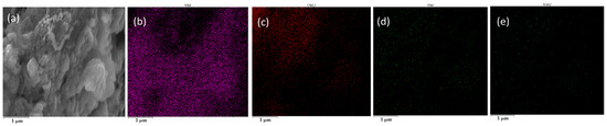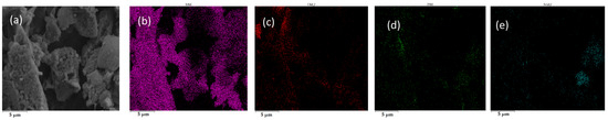 SEM image of the reaction between C, Fe2O3, and SiO2. (a) Electron microscopy image of the product, (b) Si, (c) C, (d) O, and (e) Fe.