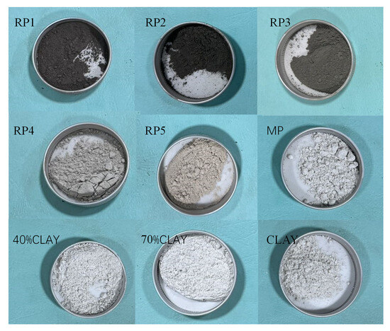 Given the significant variability in field-collected reclaimed powder, artificial reclaimed powder was prepared to obtain more trend-conclusive results. The artificial samples were created by artificially adding 40% and 70% clay to limestone mineral powder (MP), designated as 40% clay and 70% clay, respectively, to simulate different cleanliness levels. Additionally, pure clay was also tested for reference.