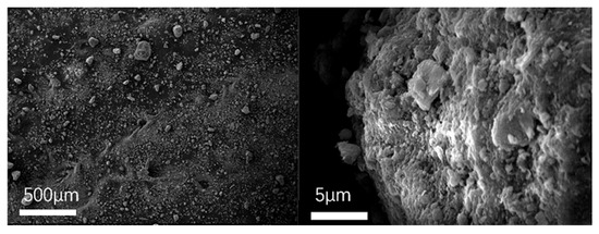 Based on the sources of the reclaimed powder, its primary components were determined to be mineral powder and dust particles. To better characterize the micromorphological features of the reclaimed powder, supplementary SEM images of mineral powder and soil were obtained for comparison (Figure 8 and Figure 9).