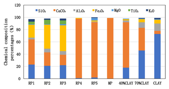 XRF testing was conducted to determine the compound contents in the nine powder materials, with the measured compound contents shown in Table 2. The data for mineral powder, 40% clay, 70% clay, and pure clay showed linear correlations. RP1, RP2, and RP3 contained relatively higher contents of calcium carbonate (CaCO3), silicon oxide (SiO2), and iron oxide (Fe2O3), along with minor amounts of other compounds including aluminum oxide (Al2O3) and potassium oxide (K2O). In contrast, RP4 and RP5 were predominantly composed of calcium carbonate.