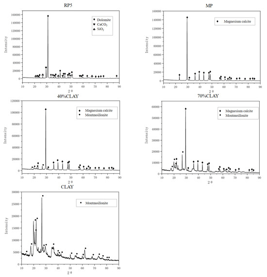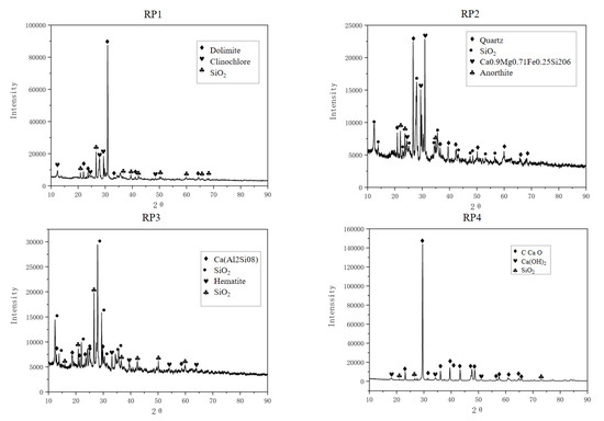 Peak fitting analysis revealed that the mineral powder had a relatively simple crystalline composition, predominantly calcite (primary component: calcium carbonate, CaCO3). As the clay content increased, the spectra became progressively more complex with additional impurity peaks, indicating higher clay impurity content primarily composed of aluminosilicates. All five reclaimed powder samples exhibited sharp characteristic peaks, demonstrating their highly crystalline nature. The main crystalline phases in the reclaimed powder were calcium carbonate (CaCO3) and silicon oxide (SiO2) crystals, including accessory minerals such as anorthite, quartz, diopside, and chlorite, along with various metal oxides. Compared to RP4 and RP5, samples RP1, RP2, and RP3 showed more impurity peaks, reflecting their more complex composition and higher impurity content, which is consistent with the XRF experimental results.