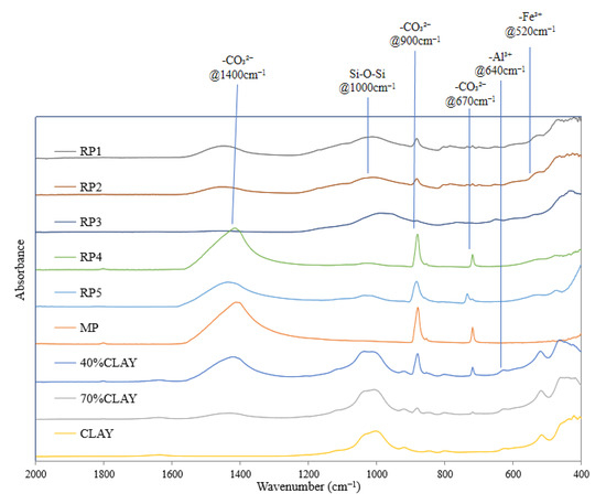 The analysis reveals a clear linear relationship between clay content and FTIR absorbance intensities for both carbonate (CO32−) and siloxane (Si-O-Si) functional groups across the four reference samples (mineral powder, 40% clay, 70% clay, and pure clay). Specifically, RP4 and RP5 exhibit strong carbonate peaks (1400, 900, 670 cm−1) with minimal Si-O-Si absorption (1000 cm−1); RP3 shows pronounced peaks for both functional groups; and RP1 and RP2 demonstrate moderate absorbance for both peaks. These spectral patterns align with previous XRF, XRD, and MBV test results, confirming the consistency of our multi-technique characterization approach for evaluating reclaimed powder properties.