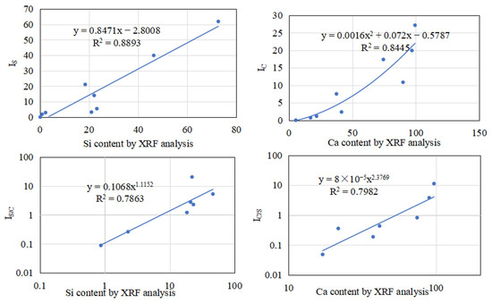 To verify the correlation between the acidity/alkalinity indicators extracted from the FTIR tests and the actual material properties, a correlation analysis was conducted between the calculated functional group indices and XRF results, with IC and IS analyzed in standard Cartesian coordinates, while IS/C and IC/S were evaluated in logarithmic coordinates. The correlation analysis mainly focuses on empirical formula fitting to establish a predictive relationship for the performance of the recycled powder [29], as shown in Figure 14.