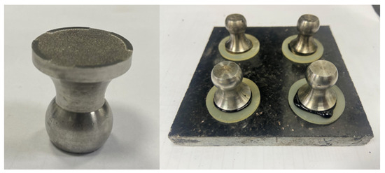 Therefore, in addition to XRF testing, pull-off tests were conducted on asphalt mastics incorporating different reclaimed powders. ESSO 70# asphalt (produced by ExxonMobil, Houston, TX, USA) was heated to 150 °C and mixed with nine types of powder materials at a 25% filler content. The fluid asphalt mastic was then dropped onto a basalt aggregate substrate, covered with a pull-head, and subjected to controlled pressure. The pull-head design featured a 0.2 m protruding edge at the bottom to serve as a support, allowing for excessive asphalt mastic to flow out through overflow channels. The pull-head configuration for the pull-off test is illustrated in Figure 15.