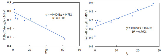Correlation between FTIR index (IS, IC) and pull-off strength.