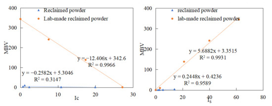 The analysis first reveals that the addition of clay significantly increases methylene blue values (MBVs) (orange data points in the figure), demonstrating its substantial impact on cleanliness. While the IS index shows strong predictive capability for both clay-rich samples and conventional reclaimed powder samples, the IC index performs well only for high-clay-content samples but performs poorly for standard reclaimed powders, indicating limited sensitivity. Given that field-collected reclaimed powders are more representative of real-world conditions, the IS index is recommended as the preferred predictor for practical applications.