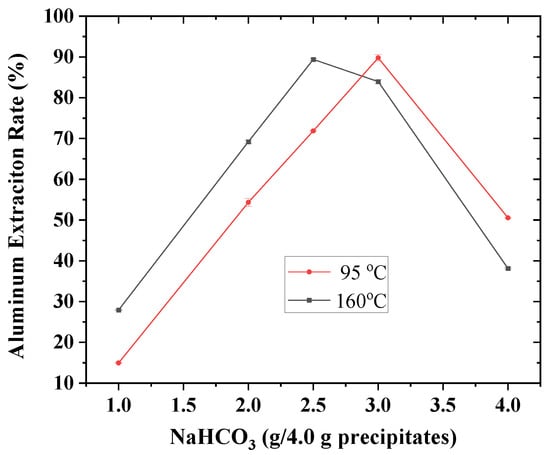 With the addition of lime for alkali regeneration, the aluminum-rich precipitates were analyzed by XRF, and the results are given in Table 2. Aluminum extractions could be made by reacting sodium bicarbonate with calcium aluminate hydrate for the formation of sodium aluminate, calcium carbonate and sodium hydroxide [18]. According to Figure 1, for the reactions at 160 °C, the highest extraction rate was above 90% at the sodium bicarbonate addition of 2.5 g/4.0 g precipitates, and with adding more of the reagent, the extraction rate decreased to below 40%. For the reactions at 95 °C, the extraction rate steadily increased from below 20% to over 90% with increasing the reagent addition from 1.0 to 3.0 g/4.0 g precipitates. For the experiments at 95 °C at the reagent addition of 4.0 g/4.0 g precipitates, the aluminum extraction descended to about 50%. Therefore, higher temperatures could be beneficial to aluminum extractions. Though necessary for aluminum extractions, sodium bicarbonate could decrease the extraction rates if added in excess [12,18].