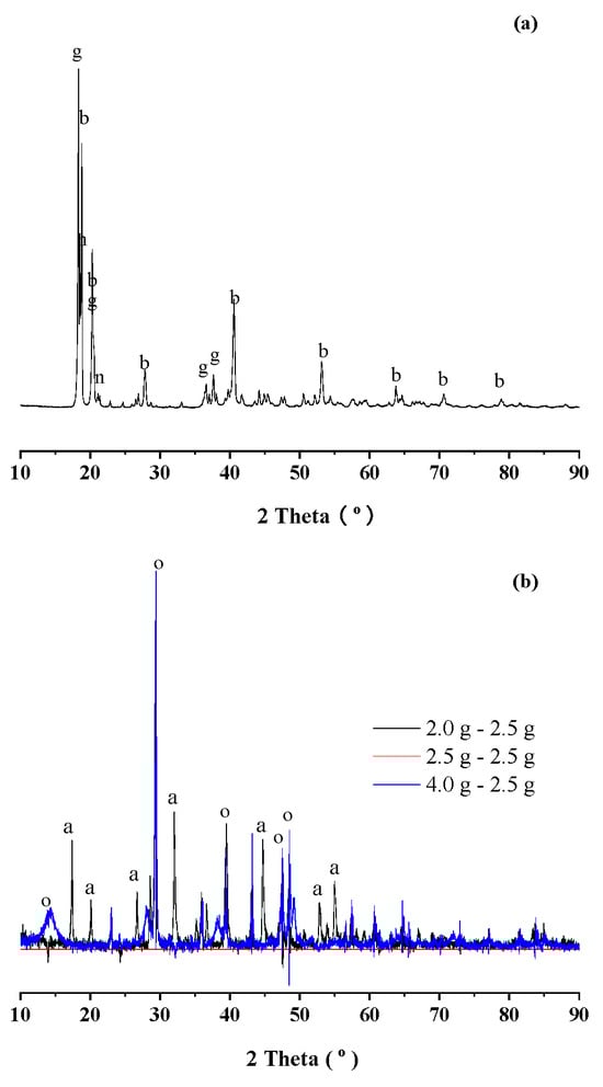 (a) XRD diagram of new precipitates collected from the walls of plastic bottles for the aluminum extraction at 95 °C with the sodium bicarbonate addition of 4.0 g/4.0 g precipitates. (b) XRD difference spectra for the aluminum extractions at 160 °C for the sodium bicarbonate additions of 2.0 and 4.0 g/4.0 g precipitates, with respect to the sodium bicarbonate addition of 2.5 g/4.0 g precipitates. Note: g for gibbsite (PDF 74-1775), b for bayerite (PDF 74-1119), n for nordstrandite (PDF 85-1049), a for CA hydrate (PDF 77-0240), o for boehmite (PDF 74-1895) in the diagram.