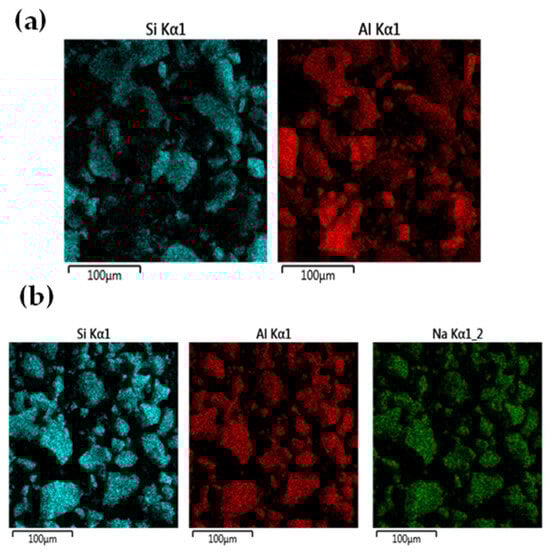 In Figure 6, the role of silicon in Route One can be highlighted by the SEM/EDS images of spatial distributions of silicon, aluminum and sodium elements. In Figure 6a, for the dried cakes soaked with water at 60 °C after calcination at 350 °C, the same region was investigated by SEM/EDS, and the blue patterns contributed by silicon element can be observed to separate from the red patterns contributed by aluminum element. This should be attributed to the formation of silica gels during evaporation of deashing acid solutions [10,19], prior to calcination and water soaking. In Figure 6b, for the dried cakes treated by diluted alkali solutions at 90 °C, the same region was also investigated by SEM/EDS; the blue patterns contributed by silicon element can be observed to strikingly resemble the red and green patterns contributed by aluminum and sodium elements. This should be attributed to the formation of albite after treatment by diluted alkali solutions.