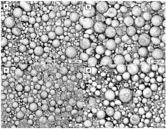 Micrographs of granulated powders dedicated to fabrication of (a) P, (b) M, (c) K, and (d) N group inserts.