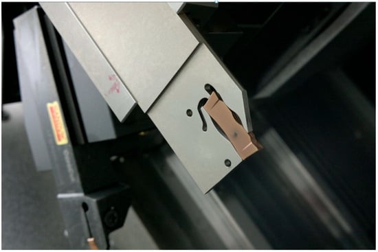 Cutting tests were carried out using the CNC DMG MORI NEF 400 universal turning machine (Mach4Metal BV, Babberich, Holand) powered by a 18.5 kW main motor. Additionally, 3 mm wide double-edge grooving inserts were mounted laterally in a specially designed Polcomm DEBL 32N30 tool holder, shown in Figure 2.