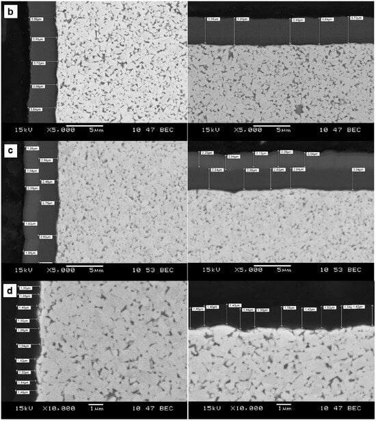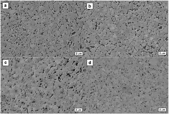 The sintered densities are near-theoretical (see Figure 3 and Table 4), i.e., neither A- and B-type porosity nor C-type uncombined carbon was detected as per ISO 4499-4:2016 [35]. Similarly, the eta-phase that forms in carbon-deficient materials was not found in the examined samples.