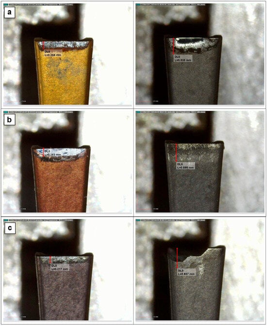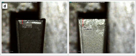 Because the acceptance criteria for all four types of coatings were also met, the coated and uncoated grooving inserts were subjected to the pin-on-disc wear test described in Section 2. The widths of the flank wear lands were measured and used as wear resistance estimates, as exemplified in Figure 5.