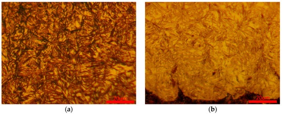 Figure 7 corresponding to Figure 4, metallographic micrographs of the spiral bevel gear at six different positions. Figure 7a shows the metallographic structure of the tooth top surface, while Figure 7b–d show the metallographic structures of the tooth top, pitch circle, and root section surfaces, respectively. The surface of the carburized layer is mainly composed of martensite and contains a small amount of residual austenite. Moving downward from the surface of the carburized layer, the microstructure gradually transitions from martensite to a mixed structure of martensite and lamellar bainite, and finally to bainite, as shown in Figure 7e,f.