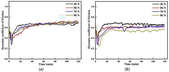 To minimize errors, the average friction coefficients are calculated by averaging the dynamic friction coefficients during the stabilization period, from the 20th minute to the end of the test. As shown in Figure 9d, the average coefficient of friction for the P1 specimen fluctuates between 0.66 and 0.67 across the four loads, with a minimal effect of load on the friction coefficient. The average coefficient of friction for the P2 specimen fluctuates between 0.54 and 0.67, decreasing as the load increases. According to modern friction theory, an increase in normal load enlarges the actual contact area, thereby reducing the friction coefficient [22]. The average coefficient of friction for the P2 specimen fluctuates between 0.54 and 0.67, decreasing as the load increases. According to modern friction theory, an increase in normal load enlarges the actual contact area, thereby reducing the friction coefficient. As the load increases, the micro-convex bodies are compressed and deformed, increasing the contact area and reducing the friction coefficient. When the load reaches a critical point, the micro-convex bodies undergo shear fracture, accompanied by the plastic deformation of the material and adhesive detachment, resulting in an increase in the friction coefficient.