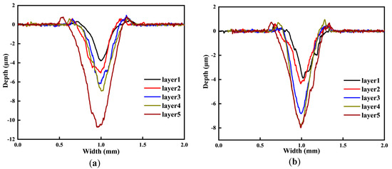 Additionally, exfoliation was observed in the wear morphology of both the second and fifth layers, primarily due to adhesive wear. Compared to the second layer, the fifth layer has a lower surface hardness, so the friction ball, with a higher hardness, transfers part of the material during adhesive wear. As the friction ball continues to slide, the transferred material gradually detaches from the friction ball due to fracture or fatigue and remains in the wear marks, forming new abrasive particles. This results in more severe abrasive wear.