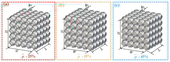 To evaluate the application of the SFRP fine–macro mechanical method analysis framework in characterizing composite structural properties, a three-periodic minimal surface (TPMS) porous structure was selected as the study object. The TPMS structure was designed using the Lattice_Karak (v 1.0) (Hyderabad, Telangana, India) software developed by Raju [22]. During the design process, the built-in Schwarz Primitive trigonometric function of the software was employed. Key parameters were established, including the wall thickness (δ) of individual unit cells, the unit cell size (6 mm × 6 mm × 6 mm), and the number of cells along each spatial direction (5 cells in X, Y, and Z) [23]. Figure 2 illustrates three Schwarz primitive porous structures with varying volume fractions, each with dimensions of 6 mm × 6 mm × 6 mm. These structures exhibit volume fractions of 25%, 35%, and 45%, corresponding to single-cell wall thicknesses (δ) of 0.438 mm, 0.613 mm, and 0.787 mm, respectively. The overall dimensions of the assembled TPMS structures are 30 mm × 30 mm × 30 mm.