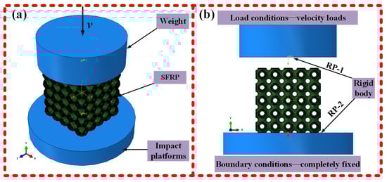 Numerical modelling of SFRP porous structures at medium strain rates. (a) Overall model: SFRP sandwiched between upper (velocity v) and lower rigid bodies; (b) Boundary/loading: upper (RP-1, velocity load); lower (RP-2, fully constrained).