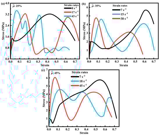 At the conclusion of the impact experiment, time–voltage signals recorded by the oscilloscope were processed to obtain the stress–strain curves of the SFRP porous structure. Figure 4 illustrates these curves for three different volume fractions of SFRP porous structures under varying strain rates. The curves display multiple peaks, primarily due to localized stresses generated during the layer-by-layer fragmentation of the specimen. Image analysis of the impact process reveals that the drop hammer experienced slight rebound after the initial impact, momentarily losing contact with the specimen and causing intermittent loading cycles. These fluctuations in the curves result from the combined effects of external loading interruptions and progressive material failure. In Figure 4a, the stress–strain curves of the 25% volume fraction SFRP porous structure show a clear trend: peak stress increases with the strain rate, particularly within the range of 8 s−1 to 43 s−1. At higher strain rates, the internal strain rate strengthening mechanism becomes predominant, leading to enhanced structural strength and a steeper ascending portion of the curve. This behavior indicates a significant strengthening effect, where peak stress occurs at progressively smaller strain values, following the principle that higher strain rates induce more pronounced strengthening. Because at this fraction, characterized by low porosity (unit-cell wall thickness: 0.438 mm) and uniform fiber dispersion with relatively stable interfacial bonding, strain rate hardening mechanisms (e.g., matrix plastic hardening and enhanced fiber–matrix co-loading capacity) dominate the mechanical response as the strain rate increases from 8 s−1 to 43 s−1. Insufficient time exists for significant interfacial debonding or fiber clustering to occur. Consequently, the stress curve exhibits a steep ascending slope and a reduced peak strain (Figure 4a), indicating that the material readily enters an elastic strengthening phase at high strain rates, with deformation concentrated in global compression rather than localized damage.