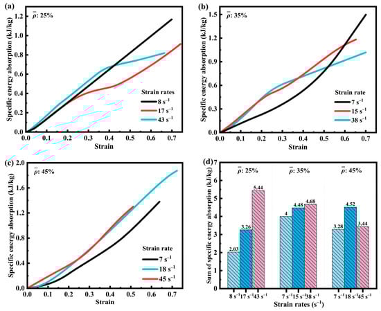 Figure 6 illustrates the variation of specific energy absorption (SEA) [40,41] with strain for three volume fractions of SFRP porous structures at different medium strain rates. As can be observed, all SEA–strain curves exhibit a continuous increasing trend with increasing strain. Figure 6a indicates that the SFRP porous structure with a 25% volume fraction contains relatively fewer interfacial defects, which is attributed to its lower volume fraction. Consequently, its mechanical behavior is predominantly governed by the strain rate strengthening mechanism. At higher strain rates, the improved synergistic load-bearing capacity at the fiber–matrix interface significantly enhances the SEA during deformation. This efficiency stems from stable energy dissipation paths enabled by low porosity and uniform interfaces. Increased strain rates enhance the co-deformation capability of fibers and the matrix, improve plastic work conversion efficiency, and promote uniform shear band propagation, preventing premature localized failure from interrupting energy absorption. As shown in Figure 6d, the SEA at a strain rate of 43 s−1 is 2.18 kJ/kg higher than that at 17 s−1 and 3.41 kJ/kg higher than that at 8 s−1, highlighting the significant impact of strain rate strengthening on materials with low volume fractions.