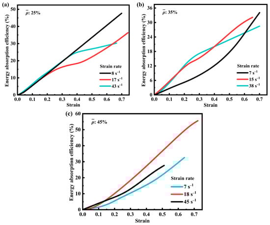 To address the limitations associated with relying exclusively on specific energy absorption metrics, the variation of energy absorption efficiency (EAE) with strain was investigated for SFRP porous structures with three volume fractions at various medium strain rates, as illustrated in Figure 7 [42,43]. As depicted in Figure 7a, the SFRP porous structure with a 25% volume fraction demonstrates a steady increase in EAE at a lower strain rate (8 s−1), indicating a stable response to progressive strain accumulation. At higher strain rates (14 s−1 and 43 s−1), the curves exhibit a steep initial rise followed by a more gradual increase during the later deformation stages. This behavior arises from the combined influence of strain rate reinforcement and constraints imposed by deformation limits. The steep initial slope of the energy absorption efficiency curve at high strain rates (Figure 7a) reflects the “gain effect” of strain rate hardening concentrated in the early deformation phase.