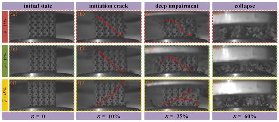 The stress–strain curves obtained from drop-weight impact tests on SFRP porous structures at medium strain rates indicate that the overall structural response during loading evolves through several distinct phases: elastic deformation, plastic deformation, shear damage, extensive damage, compressive collapse, and densification rebound. The damage and failure modes observed in SFRP porous structures with three different volume fractions at various strain levels (0%, 10%, 25%, and 60%) under impact loading conditions are presented in Figure 8. At a compressive strain of approximately ε = 10%, a 45° inclined crack forms in structures with all three volume fractions. This crack generally propagates from the top layer to the bottom layers, forming the initial shear zone (as illustrated in Figure 8b,f,j). This phase represents the onset of localized damage induced by impact loading.