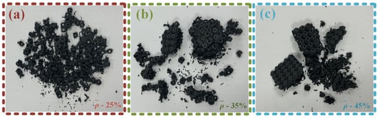 Morphology of damaged fragments after the failure of SFRP structures with three volume fractions. (a) Fragment morphology of SFRP porous structure with 25% volume fraction; (b) Fragment morphology of SFRP porous structure with 35% volume fraction; (c) Fragment morphology of SFRP porous structure with 45% volume fraction.