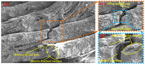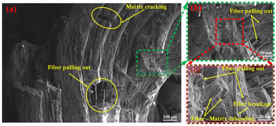 Scanning electron microscopy (SEM) observations were performed on the fractured fragments of the SFRP porous structures following the experiments, offering valuable insights into the mesoscopic damage characteristics. Figure 10 presents the mesoscopic damage features of the SFRP porous structure with a 25% volume fraction under medium strain rate loading conditions. The observations reveal several key aspects related to the fiber–matrix interaction and associated damage mechanisms. The interfacial bonding quality between the fibers and matrix is found to be weak, with widespread debonding observed throughout the structure. Fiber pull-out is extensively present, with some fibers displaying fracture patterns consistent with plastic shear failure. In regions where fiber pull-out has occurred, residual voids or pull-out channels are clearly visible on the matrix surface. The matrix in these fiber pull-out zones exhibits pronounced plastic deformation, characterized by surface folding and tearing, which contributes to the formation of an interconnected microcrack network. Additionally, distinct macroscopic cracks are identified within the matrix, and fragmented fibers are distributed across certain areas of the fracture surface. Collectively, these features—fiber pull-out, matrix deformation, and crack propagation—demonstrate the complex mechanical interactions between the fibers and matrix under impact loading, particularly in SFRP porous structures with lower volume fractions. This “progressive debonding” facilitates slow shear band propagation (Figure 8b–d), culminating in complete structural fragmentation (Figure 9a), with energy dissipated via fiber–matrix friction and matrix plastic deformation.