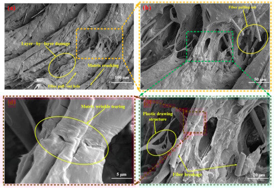 Mesoscopic damage of the SFRP porous structure with a 35% volume fraction at a medium strain rate. (a) Low-magnification SEM image: overall damage morphology featuring layer-by-layer damage, matrix cracking, and distinct fiber pull-out holes, illustrating the macroscopic damage distribution; (b) Magnified view (yellow-dashed region in (a)): detailed observation of fiber pulling out behavior and internal porous damage features; (c) Higher-magnification view (green-dashed region in (b)): microscale damage mechanisms revealed, including plastic drawing structures (matrix plastic flow characteristic) and fiber breakage; (d) High-magnification SEM image(red-dashed region in (c)): characteristic matrix wrinkle tearing morphology, reflecting localized shear deformation of the matrix.