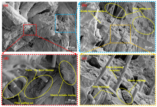 Mesoscopic damage of the SFRP porous structure with a 45% volume fraction at a medium strain rate. (a) Low-magnification SEM image: overall fracture morphology featuring brittle fracture surface and fiber pull-out; (b) Magnified view (blue-dashed region in (a)): detailed observation of brittle fracture surface and prominent fiber pull-out; (c) Higher-magnification view (yellow-dashed region in (b)): microscale damage mechanisms revealed, including plastic drawing structures, fiber breakage, and matrix cracking; (d) Magnified view (red-dashed region in (a)): characteristic damage features including layer-by-layer damage, matrix wrinkle tearing (reflecting localized shear deformation), and fiber pull-out.