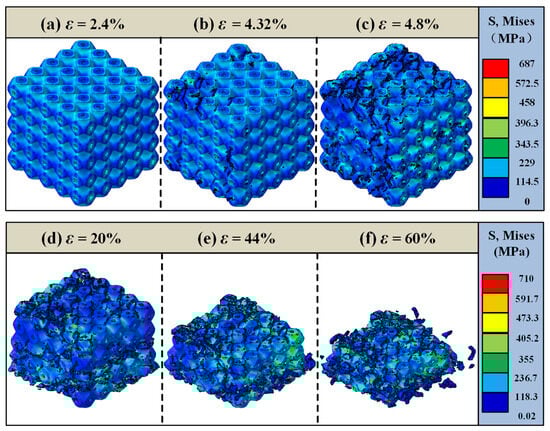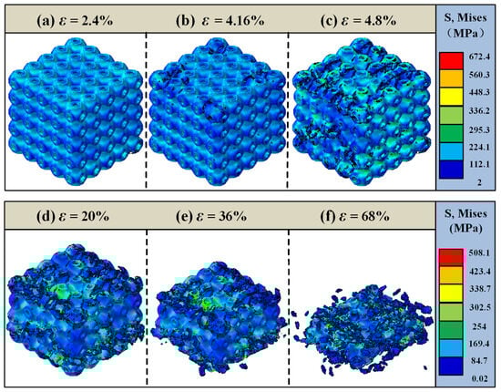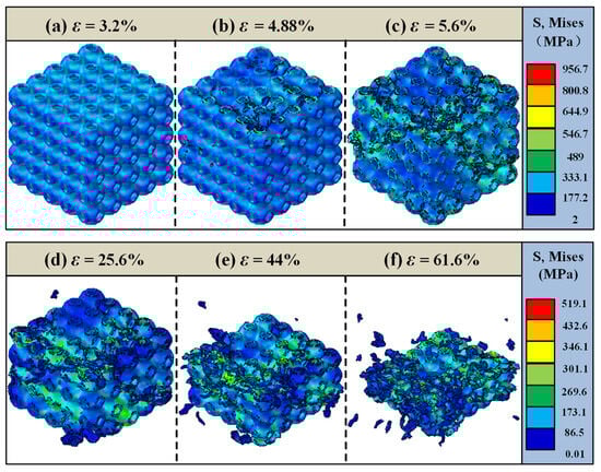 Failure analysis of the 25% volume fraction SFRP porous structure under medium strain rate loading. (a) ε = 3.2%, elastic deformation phase; (b) ε = 4.88%, initial crack sprouting; (c) ε = 5.6%, shear zone formation; (d) ε = 25.6%, aggravation of damage; (e) ε = 44%, collapse of the middle area; (f) ε = 61.6%, completely fails.