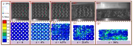 Figure 16 presents a comparison between the experimental observations and numerical simulations of the damage and failure modes of an SFRP porous structure with a 25% volume fraction under medium strain rate loading. At ε = 0, the structure is in its initial state, with loading initiated thereafter. When the strain reaches ε = 4%, the experimental results indicate uniform deformation of the structure along the loading direction. Simultaneously, the stress cloud maps from the numerical simulation begin to reveal trace stress distributions, marking the elastic deformation stage. As loading progresses, experimental crack initiation at ε = 6.5% corresponds to simulated stress concentration at ε = 5.6% (Figure 12), with a minor discrepancy of 14%. This validates the model’s capture of stress concentration around pores (the weak points for crack initiation). This indicates the onset of crack damage initiation at specific regions of the structure. At a strain of ε = 23.4%, the experimental results reveal significant crack propagation and shear damage, consistent with the stress extension paths observed in the numerical simulation’s stress cloud diagrams. Damage develops rapidly at this stage, with shear zones becoming more pronounced. By ε = 50%, the experiment shows substantial compressive deformation of the structure, accompanied by a large damage region. This is mirrored in the numerical simulation, which accurately captures the progression of damage and the stress distribution.