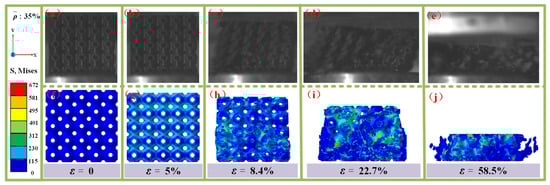 Comparison of experimental observations and simulations of the damage failure modes of SFRP porous structures with a volume fraction of 35% at medium strain rates. (a) experimental observation at ε = 0; (b) experimental observation at ε = 5%; (c) experimental observation at ε = 8.4%; (d) experimental observation at ε = 22.7%; (e) experimental observation at ε = 58.5%; (f) stress cloud for damage failure modes at ε = 0; (g) stress cloud for damage failure modes at ε = 5%; (h) stress cloud for damage failure modes at ε = 8.4%; (i) stress cloud for damage failure modes at ε = 22.7%; (j) stress cloud for damage failure modes at ε = 58.5%.