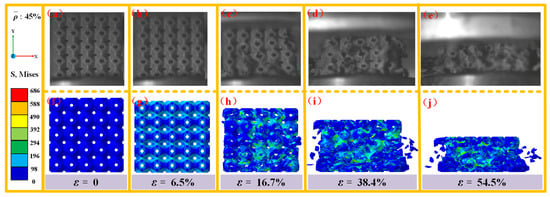 Comparison of experimental observations and simulations of the damage failure modes of SFRP porous structures with a volume fraction of 45% at medium strain rates. (a) experimental observation at ε = 0; (b) experimental observation at ε = 6.5%; (c) experimental observation at ε = 16.7%; (d) experimental observation at ε = 38.4%; (e) experimental observation at ε = 54.5%; (f) stress cloud for damage failure modes at ε = 0; (g) stress cloud for damage failure modes at ε = 6.5%; (h) stress cloud for damage failure modes at ε = 16.7%; (i) stress cloud for damage failure modes at ε = 38.4%; (j) stress cloud for damage failure modes at ε = 54.5%.