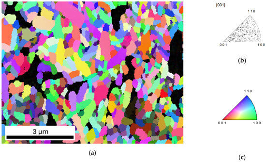 Figure 2a presents an inverse pole figure map obtained using electron backscatter diffraction (EBSD), which reveals the crystallographic orientation in the Aurivillius-type layer-structured bismuth titanium oxides. The orientation of the grains is represented by a color-coded legend (as shown in Figure 2c), which corresponds to specific crystallographic directions according to the standard inverse pole figure key. The black regions visible in the map correspond to non-indexed areas, indicating voids within the microstructure (e.g., pores) or regions with insufficient diffraction data due to the surface quality or geometrical factors.