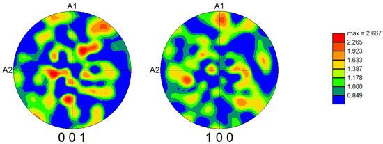 Further insight into the material texture is provided by the pole figures shown in Figure 3, which correspond to the {001} and {100} crystallographic planes. The color intensity represents the multiple of uniform distribution (m.u.d.), a quantitative measure indicating how much the observed orientation distribution deviates from a random texture. While there was some variation in intensity, the multiple of uniform distribution value was ~2.67, indicating the presence of a weak texture.