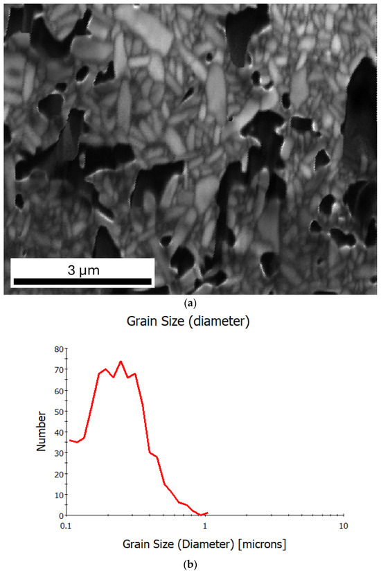 Image quality (IQ) maps are a grayscale representation, where the pixel intensities correspond to the quality of the Kikuchi diffraction patterns. Bright regions indicate high-quality patterns, usually obtained from well-crystallized and correctly prepared (well-polished and strain-free) surfaces, while darker regions suggest a poor diffraction quality caused by strain occurrence, crystallographic disorder, or porosity. Figure 4a presents an IQ map for the Bi6Fe2Ti3O18 ceramics. The grain boundaries are clearly visible and the black regions, in this case, correspond to pores. The microstructure shows relatively fine grains of a polycrystalline ceramic material, some with an elongated shape. This correlates with the grain size distribution plot (Figure 4b), where the grain diameter is shown in relation to the number of grains. The peaks around 0.3 to 0.4 µm indicate that most of the grains fell within this range. For sizes above 0.6 µm, the number of grains significantly decreased.