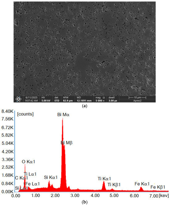 In order to complement the microstructural observations, an SEM (scanning electron microscope) image of a bigger area was introduced, as shown in Figure 5a. The observations were made using the secondary electron (SE) mode in high-vacuum mode. The presented image reveals a relatively high porosity of the Bi6Fe2Ti3O18 material. Energy-dispersive X-ray spectroscopy (EDS) measurements collected from the whole presented surface (Figure 5b) confirmed the chemical composition stability. The presence of the silicon in the spectrum can be explained by residues of silica in the pores after the polishing process. The carbon presence is explained by the sample’s surface coating.