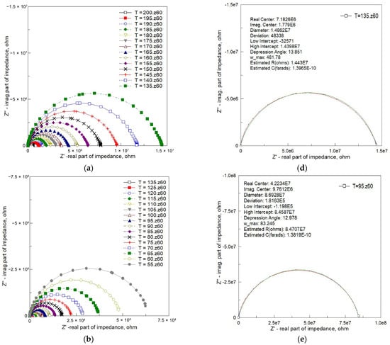 One can see from Figure 6 that the measured values of the two components of complex impedance—resistance (real part, Z’) and reactance (imaginary part, Z″)—presented in the form of Nyquist plots rarely take the shape of perfect semicircles (while the isotropic scale is preserved on both axes). They are often described as depressed or deformed semicircles, with their center lying below the x-axis (Figure 6a,b). At low temperatures, the deviation from the semicircular shape is substantial (Figure 6c).