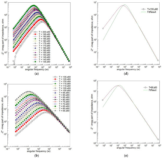 As the temperature decreased, the intercept of the arc on the real axis increased, indicating an increase in bulk resistance from ZRe = 1.44 × 107 Ω at 135 °C to ZRe = 8.46 × 107 Ω at 95 °C, and further to ZRe = 6.41 × 108 Ω at 55 °C. Concurrently, the depression angle β (indicative of the arc’s deviation from a perfect semicircle) and the characteristic frequency (ωmax) decreased: