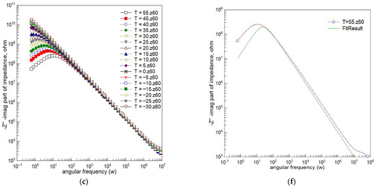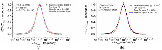 was applied to the analysis of the normalized amplitude (scaled) imaginary part of the impedance Z″/Z″max(ω). In Equation (5), Z″ represents the current value of the imaginary part of the complex impedance, Z″max and ωmax define the height and position of the peak, and “b” is an internally independent shape parameter for high frequencies.