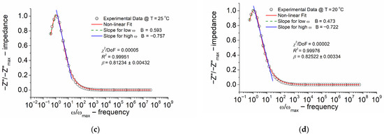 Normalized imaginary part of impedance (Z″/Z″max) versus normalized frequency (ω/ωmax). (a) Temperature T = 200 °C; (b) temperature T = 195 °C; (c) temperature T = 25 °C; and (d) temperature T = 20 °C. Values of quality parameters (χ2 and R2) and the stretching parameter β from the KWW equation are given in the legend.