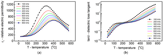 The experimental data were obtained over a measurement field frequency range of 100 kHz to 900 kHz. As shown in Figure 9a, the relative permittivity exhibited a distinct maximum within the temperature range of 300 °C to 400 °C. This peak shifted toward higher temperatures and decreased in magnitude with an increasing frequency, indicating a frequency-dispersive dielectric response. In contrast, the dielectric loss tangent (Figure 9b) initially increased slowly with temperature, reaching a value of approximately 1 between 100 °C and 300 °C, followed by a rapid increase at higher temperatures, exceeding a value of 5 for T > 450 °C.