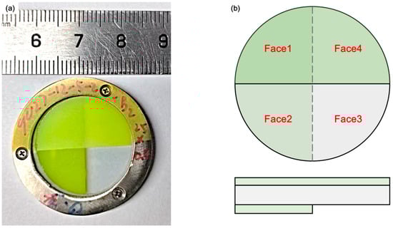 Based on the previous model developed by the research group [25], an equation set was established to obtain the tuning coefficient a and two optical transfer parameters (m1 and m2) from the area ratios (QDs/GZO) in the RL spectra of Face1, Face2, and Face4, as shown in Equation (2). a = 94.9%, indicating that 94.9% of the GZO RL entering the films was converted into CsPbBr3 QD PL.