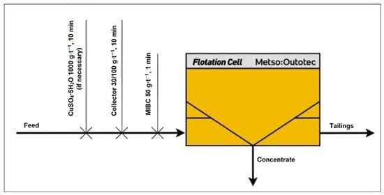 Flotation tests were carried out using an automated laboratory froth flotation unit equipped with a 2 L and 4 L Denver-type cell (Outotec GTK LabCell, Metso, Espoo, Finland). All experiments were conducted at a controlled temperature of 25 °C. The slurry was introduced into the flotation cell along with a pre-weighed sample. Agitation was initiated at 1100 rpm, followed by the sequential addition of flotation reagents.