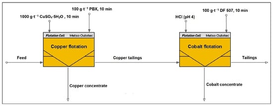 Figure 2. Schematic diagram of selective flotation of copper and cobalt concentrates, made by HSC Chemistry 10 software (10.5.4 vision), Modul HSC Sim [25].