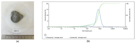 The particle size distribution (PSD) of the ore sample, obtained by “Mastersizer analysis”, is represented in Figure 3b. According to the laser scattering data, the particle size distribution of the sample ranged from 0.1 to 1000 μm, with a P80 of 102 μm, with P50 less than 72 μm.